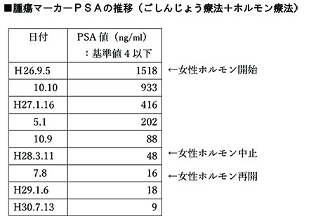 前立腺がんを判断する腫瘍マーカーPSAの数値(基準値4以下)は、平成26年9月の検査で1518だったが、血液検査ごとに大きく下降し続け、1カ月後の10月10日の検査では933まで低下した。その1年後の同27年10月9日には88まで下がり、同28年3月の検査では48まで減少。その後、ホルモン療法を中止し、ごしんじょう療法のみの治療になったが、PSAは下がり続けたことからもごしんじょう療法の治療効果は明らかだ。平成29年3月、直前の血液検査でPSAがわずかに上昇したことから、女性ホルモンを再開したが、再びPSAが減少し、平成30年7月の検査では9まで低下した(表参照)。