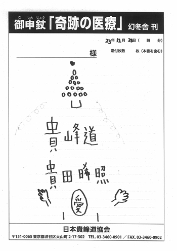 August 2012, Takuya spoke to her, 'Are you alright?' He treated her right shoulder with Goshinjo implements for 30 minutes. Takuya could tell there was accumulated Jaki (Evil life energy) around her shoulder. She realized her treated shoulder felt lighter in the train on the way home and she felt cheered up.