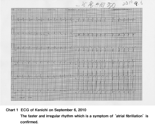 In April 2010, Kenichi Nakamura (fictitious name, age 55), self-employed male from Tokyo, suddenly felt severe pressure and discomfort in his chest and was unable to walk upstairs due to shortness of breath and palpitations. These are the typical symptoms of arrhythmia and angina. He ended up with discomfort in his chest all the time.