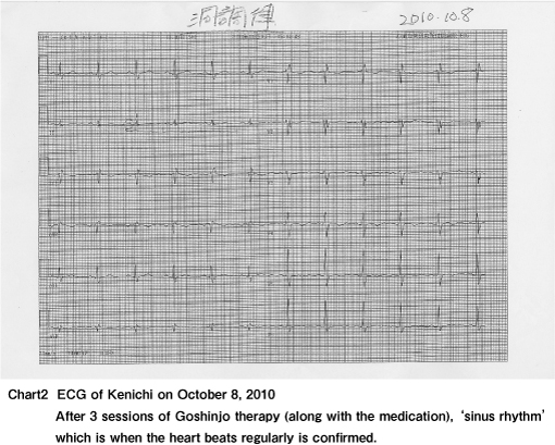 'Once a patient had atrial fibrillation at Kihodo. My disciple administered Goshinjo therapy to his back on the spot whilst I was taking his pulse. Just after 10 seconds his irregular pulse returned to normal and said, 'I feel better' on the spot.