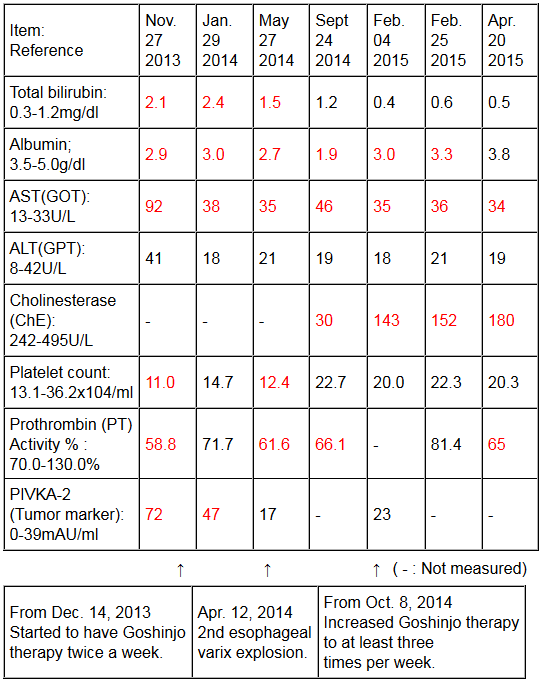 The tumor marker to check for liver cancer had dropped dramatically from 72 as of November 27, 2013 before starting Goshinjo therapy to 47 on January 29, 2014 after starting Goshinjo therapy, and then to 17 which was normal as of May 27, 2014 and have maintained normal values since.