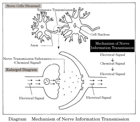 It's said that there are about 100 billions nerve cells (neurons) which make up the central nervous system such as cerebrum and cerebellum, and there are about 100 thousands of synapses (connecting areas) in each nerve cell. When bioelectricity flows in the axon, chemical substances are released from the tip of axon and the chemical substances enter the nerve cells to make bioelectricity flow. That is, after receiving information, action potential which is created in the axon of nerve cells travels to the tip of the axon as an electrical signal. This electrical signal is transformed into a chemical signal by the release of nerve transmission substances, and after being received by the nerve cells, this chemical signal is transformed into an electrical signal to receive the information. (See the Diagram below.) All life phenomena occur by the correct transformation between electrical signals and chemical signals. The five senses of sight, hearing, smell, taste and touch also are detected in the brain by transforming information into an electrical signal.