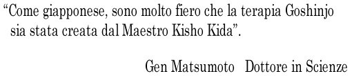L'effetto della terapia Goshinjo sul dolore acuto cronico insopportabile la cui causa è sconosciuta è estremamente elevato rispetto agli altri rimedi. Ho osservato regolarmente i trattamenti su vari pazienti, compresi i pazienti di cancro terminale, presso la Kihodo ed ho parlato con loro. Non sono però riuscito a scoprire perché questa terapia possa ridurre il dolore. Tutti i pazienti dicevano che il loro corpo si sentiva più leggero e meglio, e sono tornati a casa felici dicendo che era un miracolo. Come medico, mi sono sentito impotente e sbalordito.