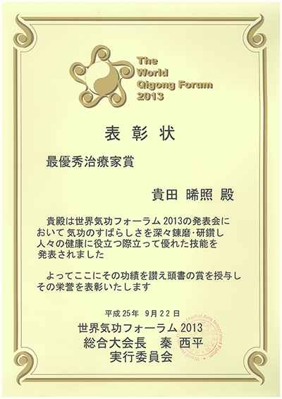 気功の持つ魅力と実力を紹介する「世界気功フォーラム2013」(世界気功フォーラム2013実行委員会、東京青少年少林寺武術気功会主催、秦西平大会実行委員長)が平成25年9月21、22日の2日間、東京・代々木の国立オリンピック記念青少年総合センターで開かれ、貴峰道の貴田晞照が「最優秀治療家賞」(写真)を受賞しました。