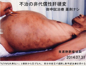 一度線維化した細胞は元に戻らないのが医学の常識ですが、ごしんじょう療法で線維化した細胞が元の正常な細胞に戻ります。大学病院でもう何も出来ないと死の宣告を受け、臨月のように腹水が溜った非代償性肝硬変の男性はごしんじょう療法で完治し、5年前に仕事に復帰し現在も元気で働いています。